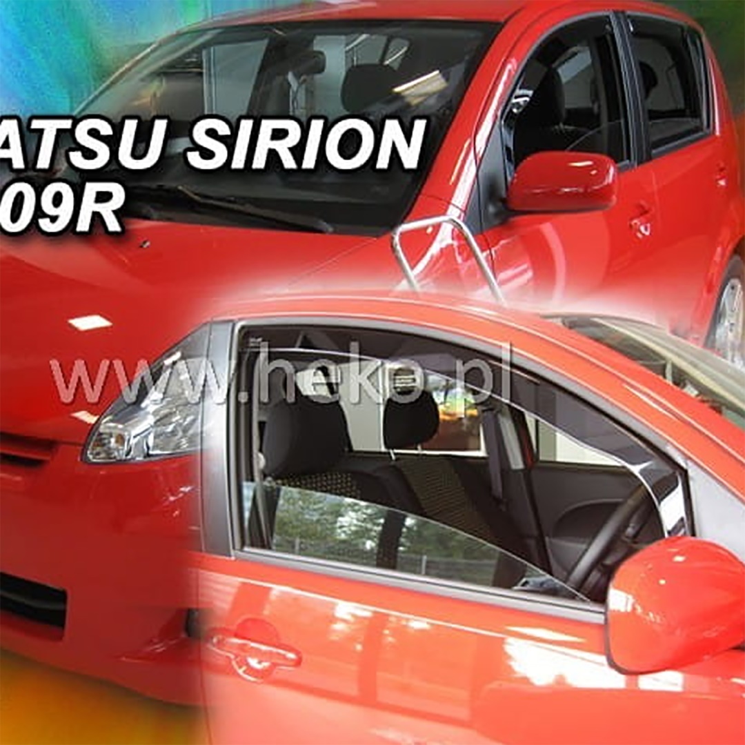 Ανεμοθραύστες παραθύρων αεροδυναμικού σχεδιασμού κατάλληλοι για DAIHATSU SIRION 5D 2005-2010. Κατασκευασμένοι από υψηλής ποιότητας εύκαμπτο πλαστικό σε σκούρο φιμέ χρώμα, είναι σχεδιασμένοι ειδικά για τις μπροστά πόρτες του οχήματος.