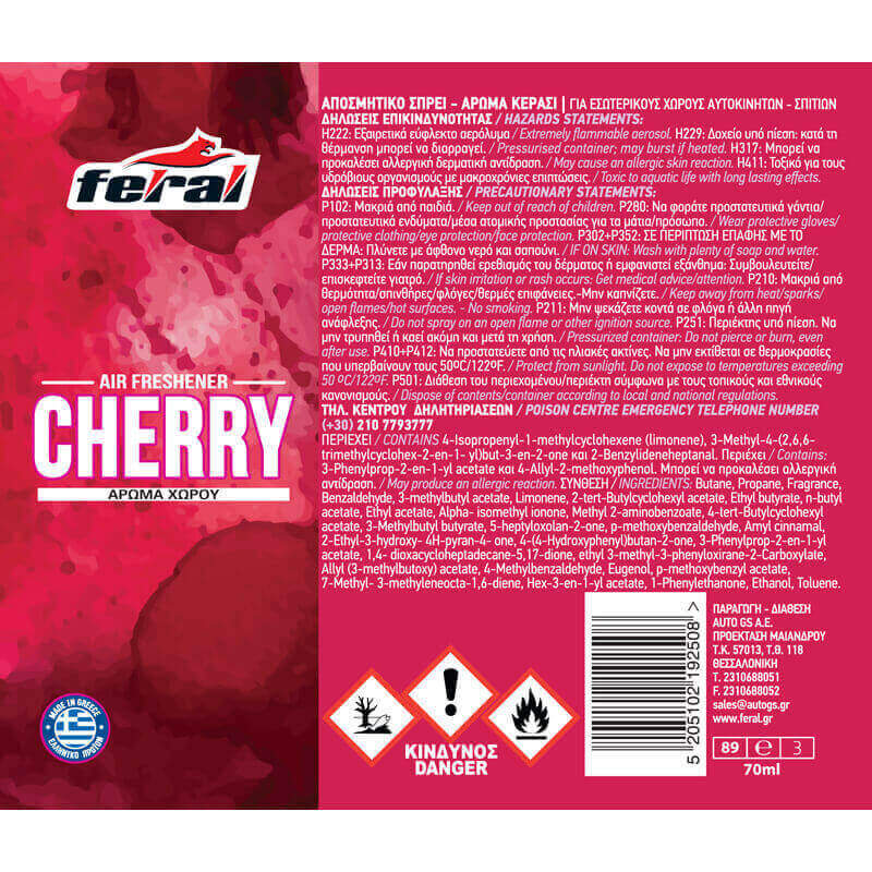 Αρωματικό αυτοκινήτου Spray Feral Fruity Collection με άρωμα Cherry.