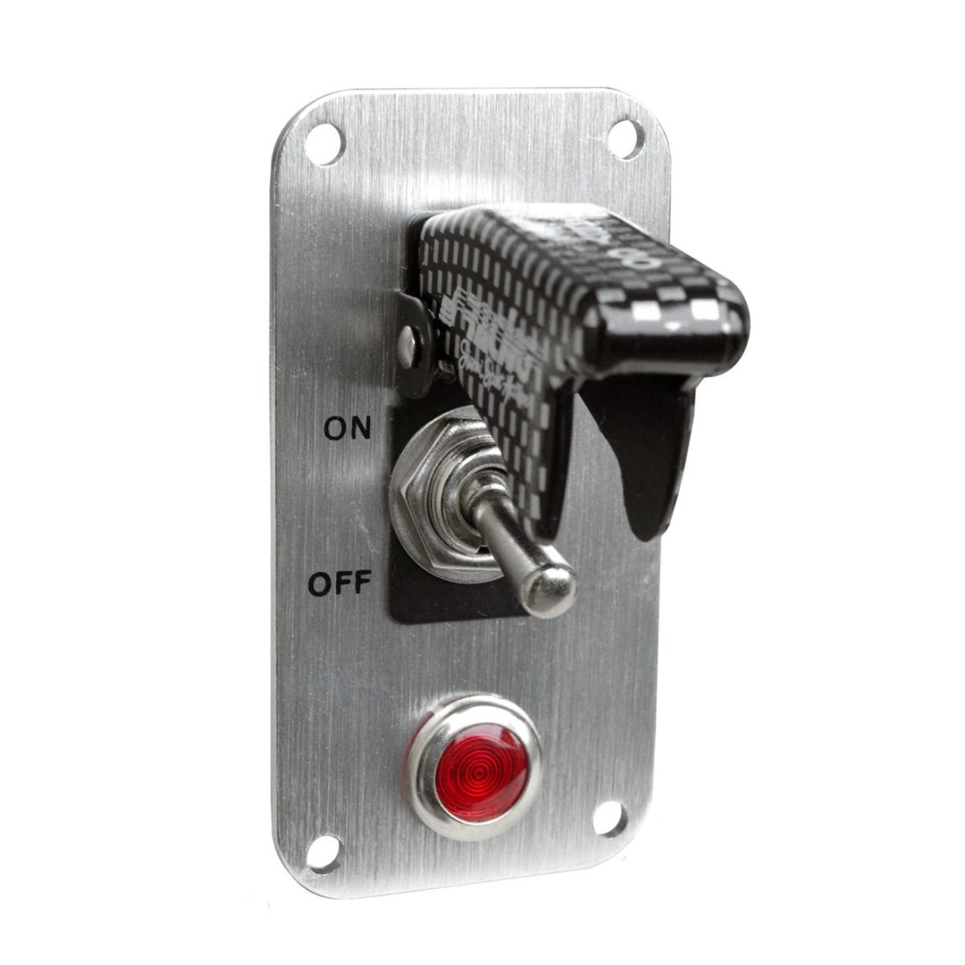 Διακόπτης on/off αεροπορικού τύπου από τη Simoni racing, ιταλικής προελεύσεως, με προστατευτικό κάλυμμα (καπάκι) από ABS πλαστικό σε carbon σχέδιο, μεταλλική βάση χρωμίου και LED ένδειξη λειτουργίας με κόκκινο φωτισμό, ώστε να γνωρίζει ο οδηγός αν είναι ενεργοποιημένος/απενεργοποιημένος κατά τη διάρκεια οδήγησης.