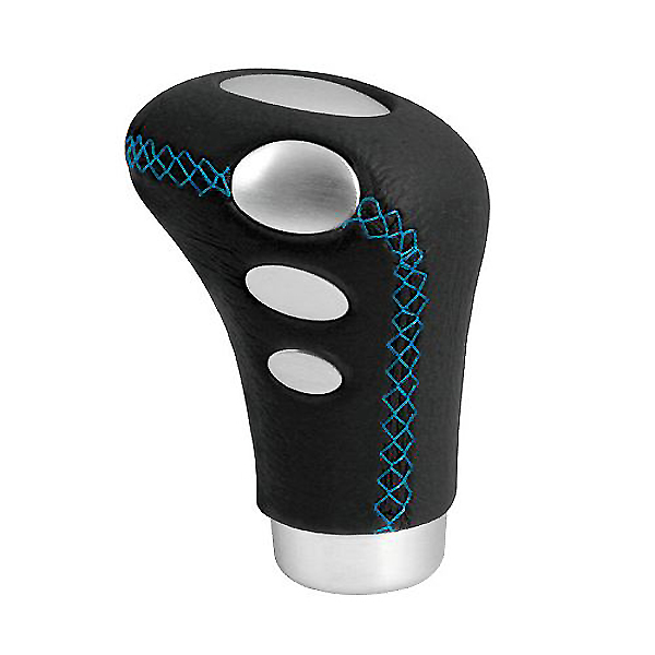 Πόμολο ταχυτήτων COBRA 1 σε μαύρο χρώμα με μπλε ραφή και λεπτομέρειες από αλουμίνιο. Κατασκευασμένο από δερματίνη, προσφέρει άνετη λαβή και εύκολο χειρισμό.