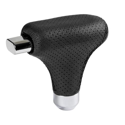 Πόμολο για λεβιέ ταχυτήτων για οχήματα με αυτόματο κιβώτιο ταχυτήτων, κατασκευασμένο από δερματίνη με μαύρες ραφές στο πλάι και βάση από χρωμιωμένο αλουμίνιο. Η συσκευασία περιλαμβάνει κιτ τοποθέτησης με 3 διαφορετικούς αντάπτορες. Universal εφαρμογή, ταιριάζει στα περισσότερα αυτοκίνητα με μοχλό ταχυτήτων με μέγιστη διάμετρο 15 mm.