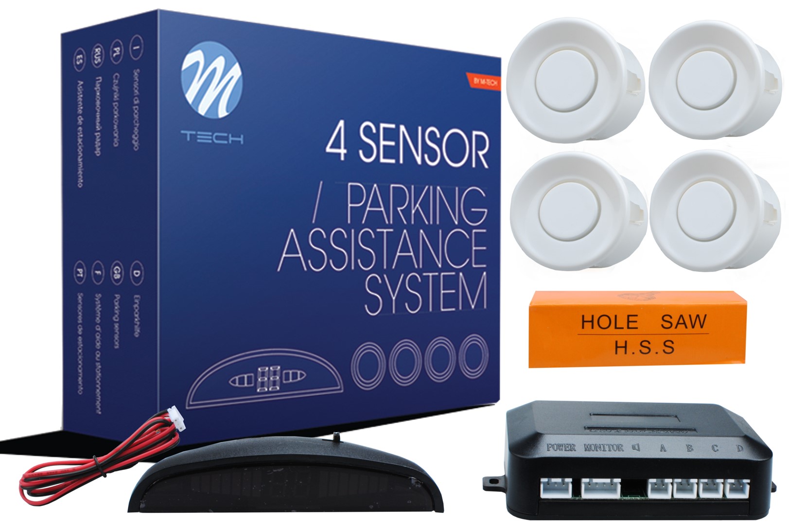 Σύστημα παρκαρίσματος 9-15 V με 4 αισθητήρες σε λευκό χρώμα και οθόνη από την εταιρεία M-TECH. Αυτό το λειτουργικό σύστημα υποβοήθησης στάθμευσης ενεργοποιείται όταν μπαίνει η όπισθεν. Οι υπερηχητικοί αισθητήρες μετρούν την απόσταση από ένα εμπόδιο και ένας βομβητής ενσωματωμένος στην οθόνη LED προειδοποιεί τον οδηγό με ηχητικά σήματα ανάλογα με την απόσταση.