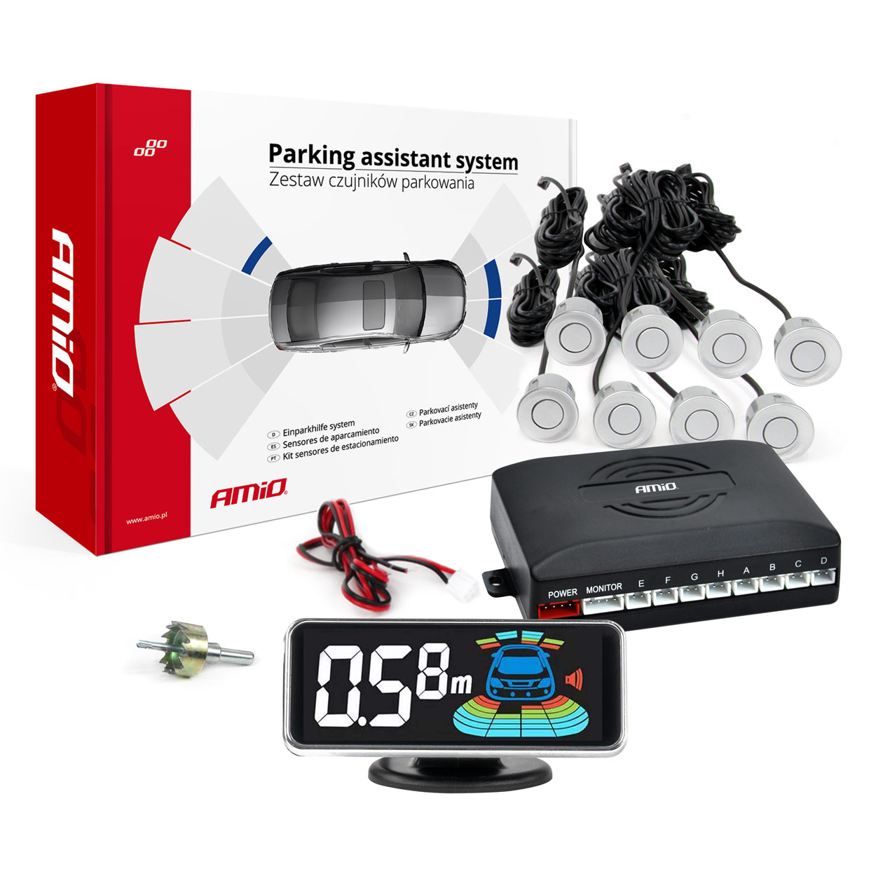 Το σύστημα παρκαρίσματος Amio διαθέτει 8 αισθητήρες και λειτουργεί με 12V. Η διάμετρος του αισθητήρα είναι 21,5mm και έρχεται σε ασημί χρώμα. Περιλαμβάνει επίσης buzzer για ήχο και οθόνη LED 3D που διευκολύνει τη διαδικασία παρκαρίσματος.