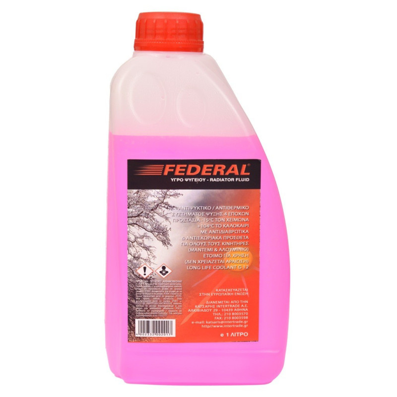 Αντιψυκτικό από την εταιρεία Federal σε συσκευασία 1lt. Είναι ένα G12 αντιψυκτικό, δηλαδή χρησιμοποιείται σε κινητήρες υψηλής ταχύτητας και θερμοκρασίας λειτουργίας, ενώ η μέση διάρκεια ζωής του είναι 4-5 χρόνια. Διατίθεται έτοιμο προς χρήση άρα δε χρειάζεται να το αραιώσετε για να το τοποθετήσετε στο όχημά σας.