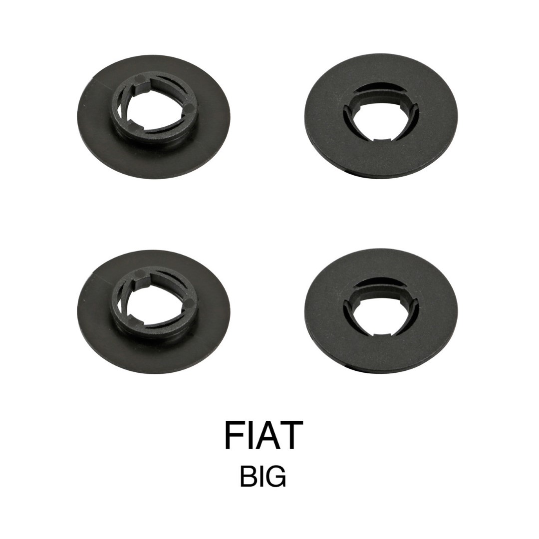 Μαρκέ κουμπώματα (κλιπς) σε μαύρο χρώμα, στρογγυλό σχήμα και μεγάλο μέγεθος, κατάλληλα για να σταθεροποιήσετε πατάκια δαπέδου σε οχήματα. Τα προϊόντα είναι συμβατά με FIAT και σχεδιασμένα για να συγκρατούν σταθερά όλα τα πατάκια (λάστιχο ή μοκέτα) στο δάπεδο του αυτοκινήτου κατά την επιβίβαση/αποβίβαση των επιβατών.