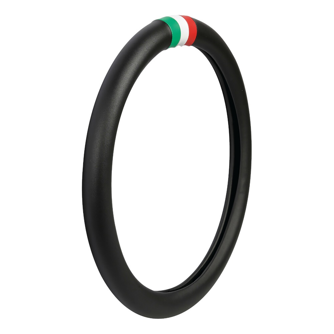Κάλυμμα τιμονιού με τους χρωματισμούς της Ιταλικής σημαίας (πράσινο/λευκό/κόκκινο) συμβατό με οχήματα που το τιμόνι είναι διαμέτρου 35/37cm. Είναι άοσμο, κατασκευασμένο από οικολογικό και μη τοξικό υλικό. Είναι εξαιρετικά μαλακό στην υφή και κατασκευασμένο από άριστης ποιότητας δερματίνη.
